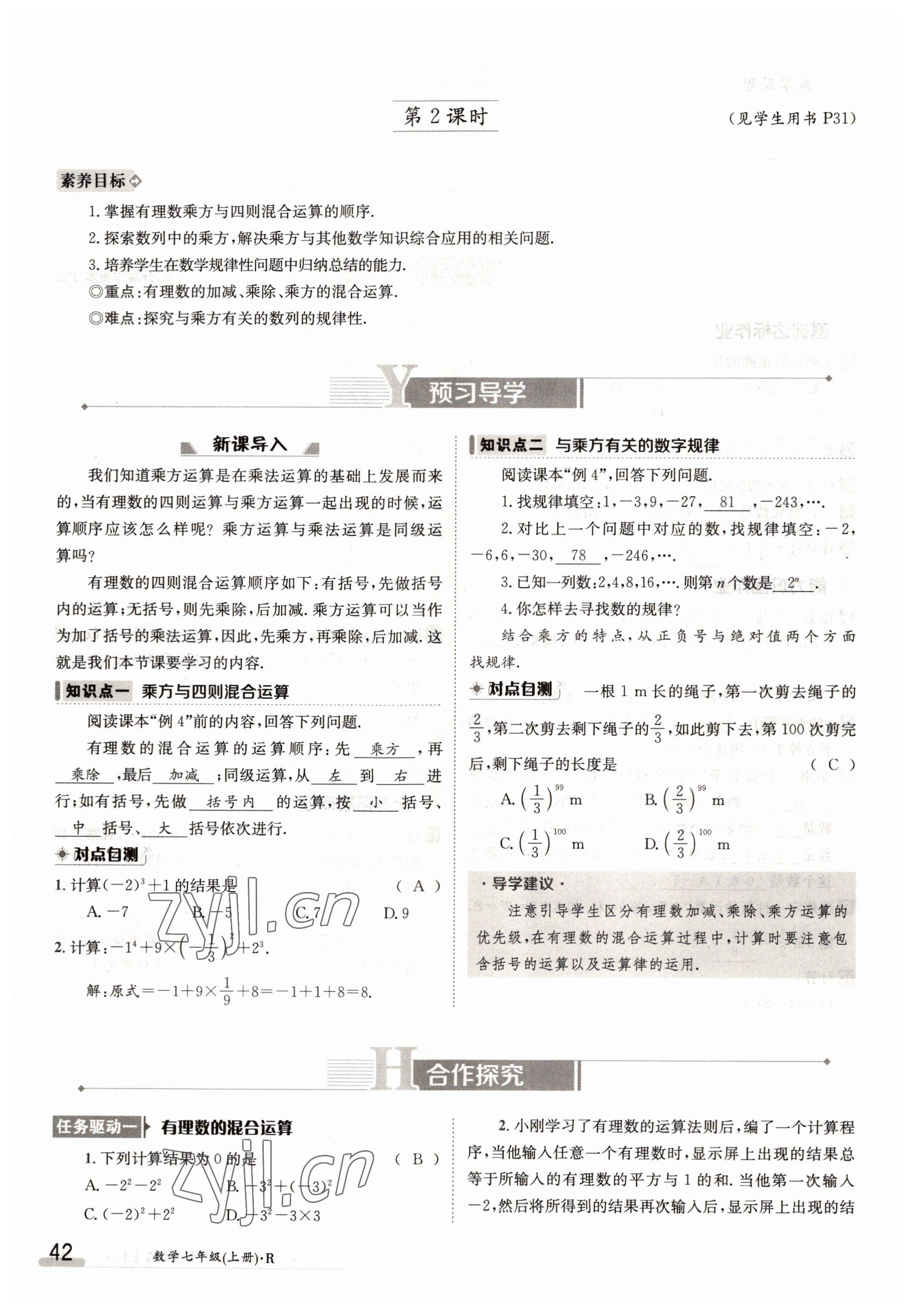 2022年金太阳导学案七年级数学上册人教版参考答案第42页