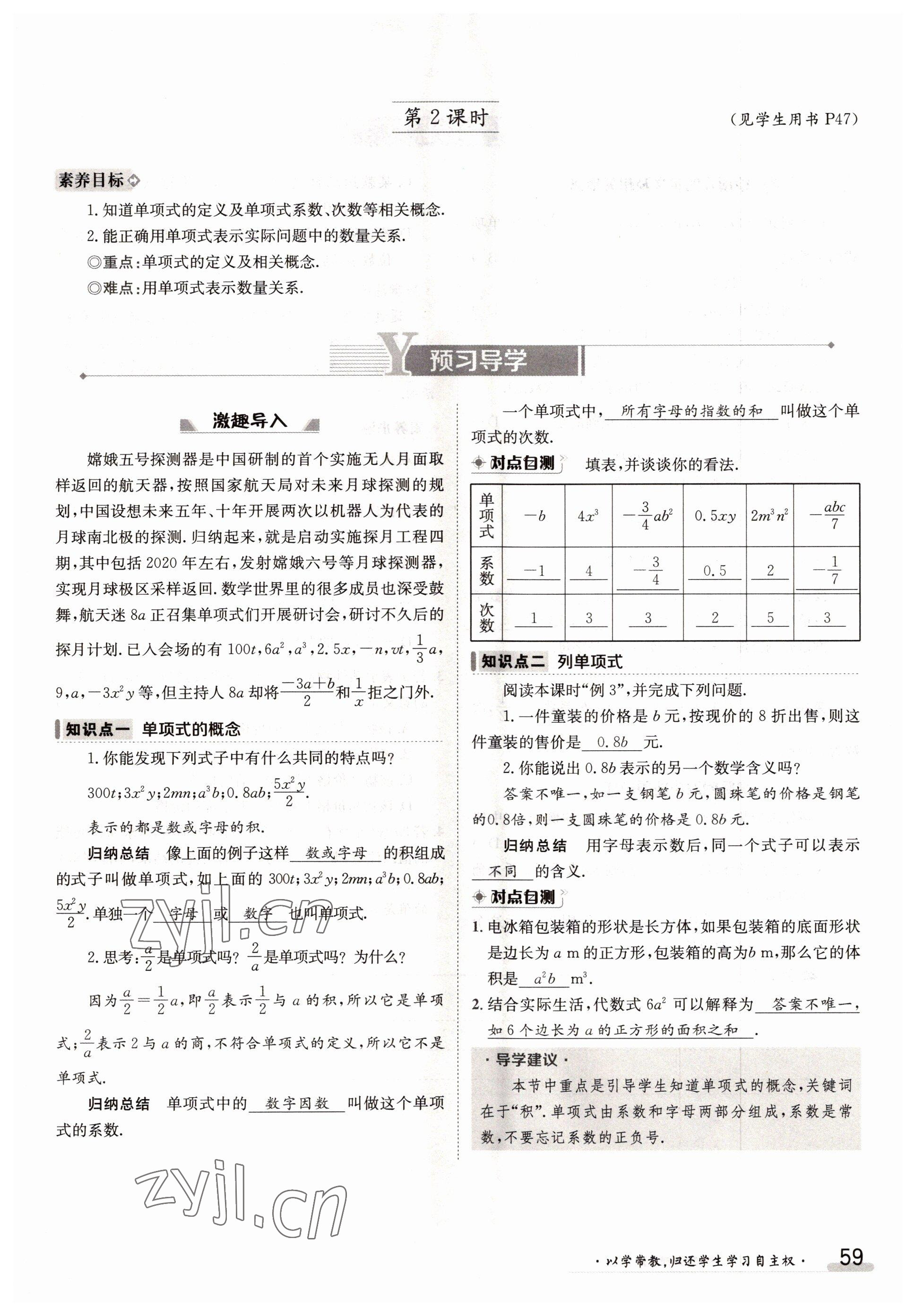 2022年金太阳导学案七年级数学上册人教版参考答案第59页