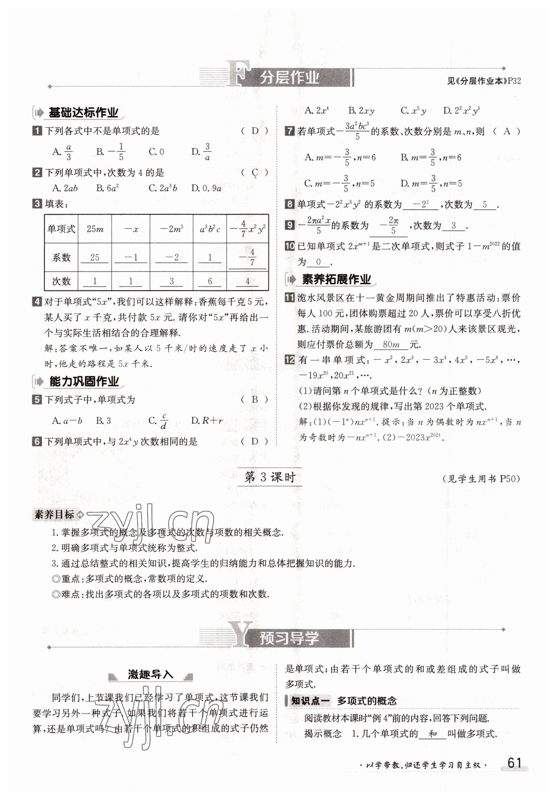 2022年金太阳导学案七年级数学上册人教版参考答案第61页