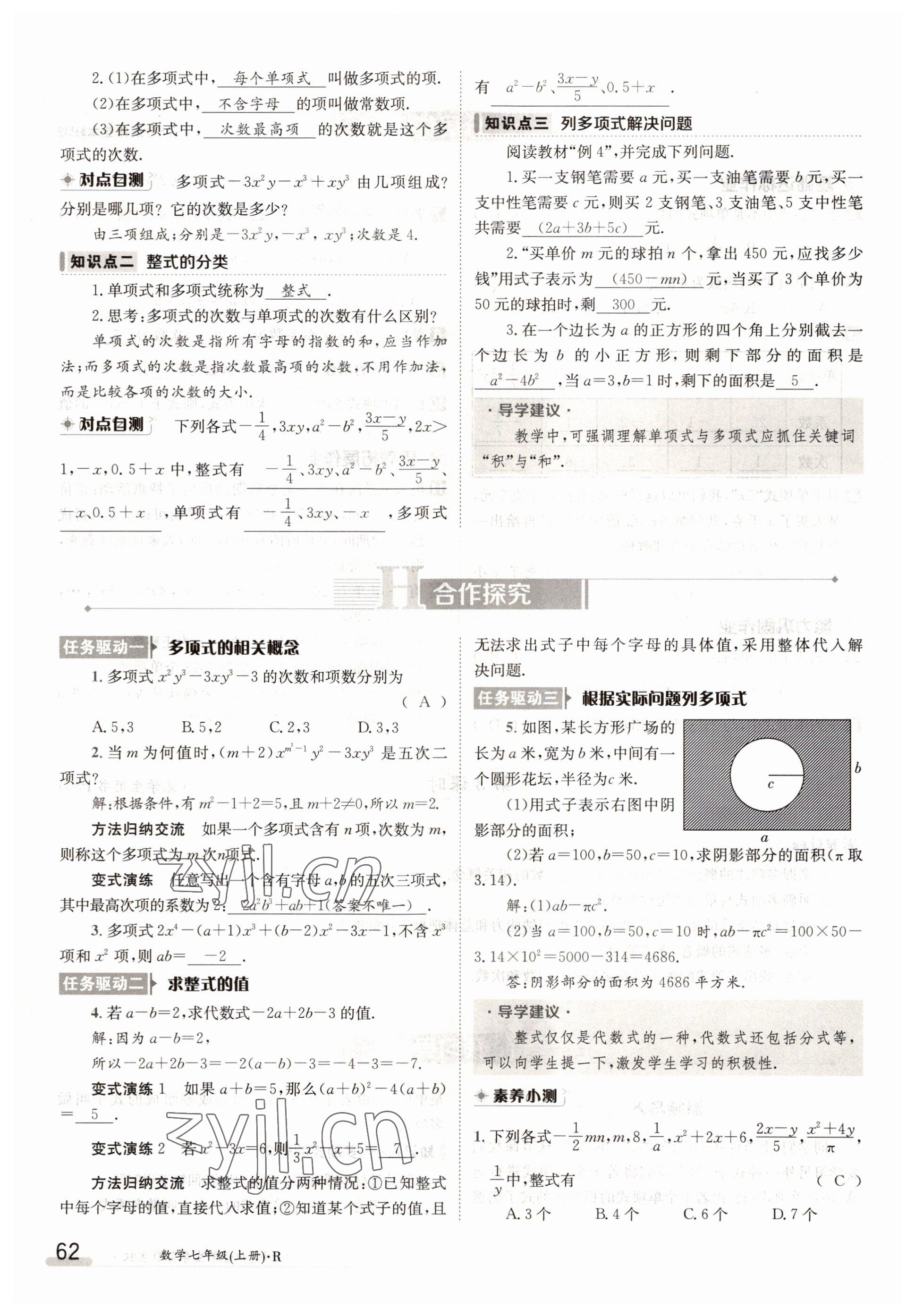 2022年金太阳导学案七年级数学上册人教版参考答案第62页