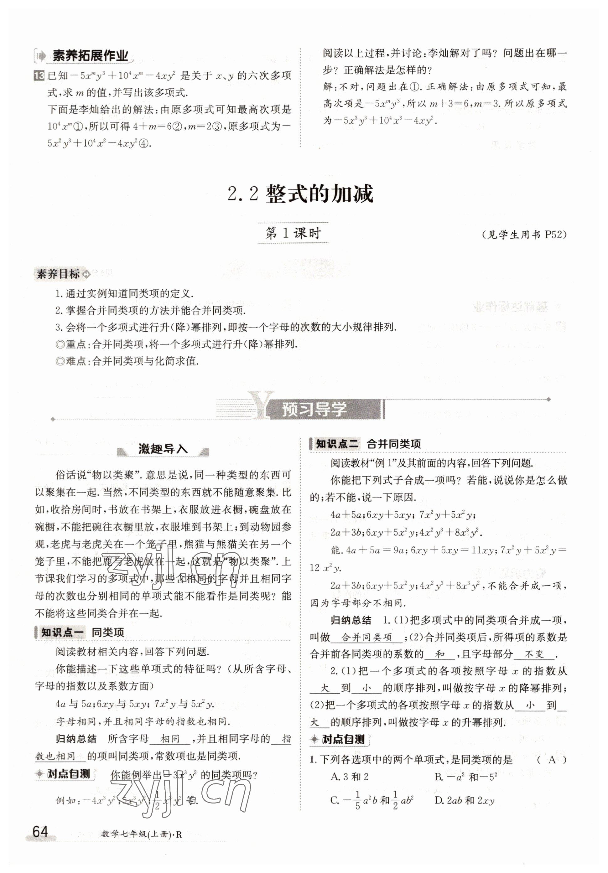 2022年金太阳导学案七年级数学上册人教版参考答案第64页