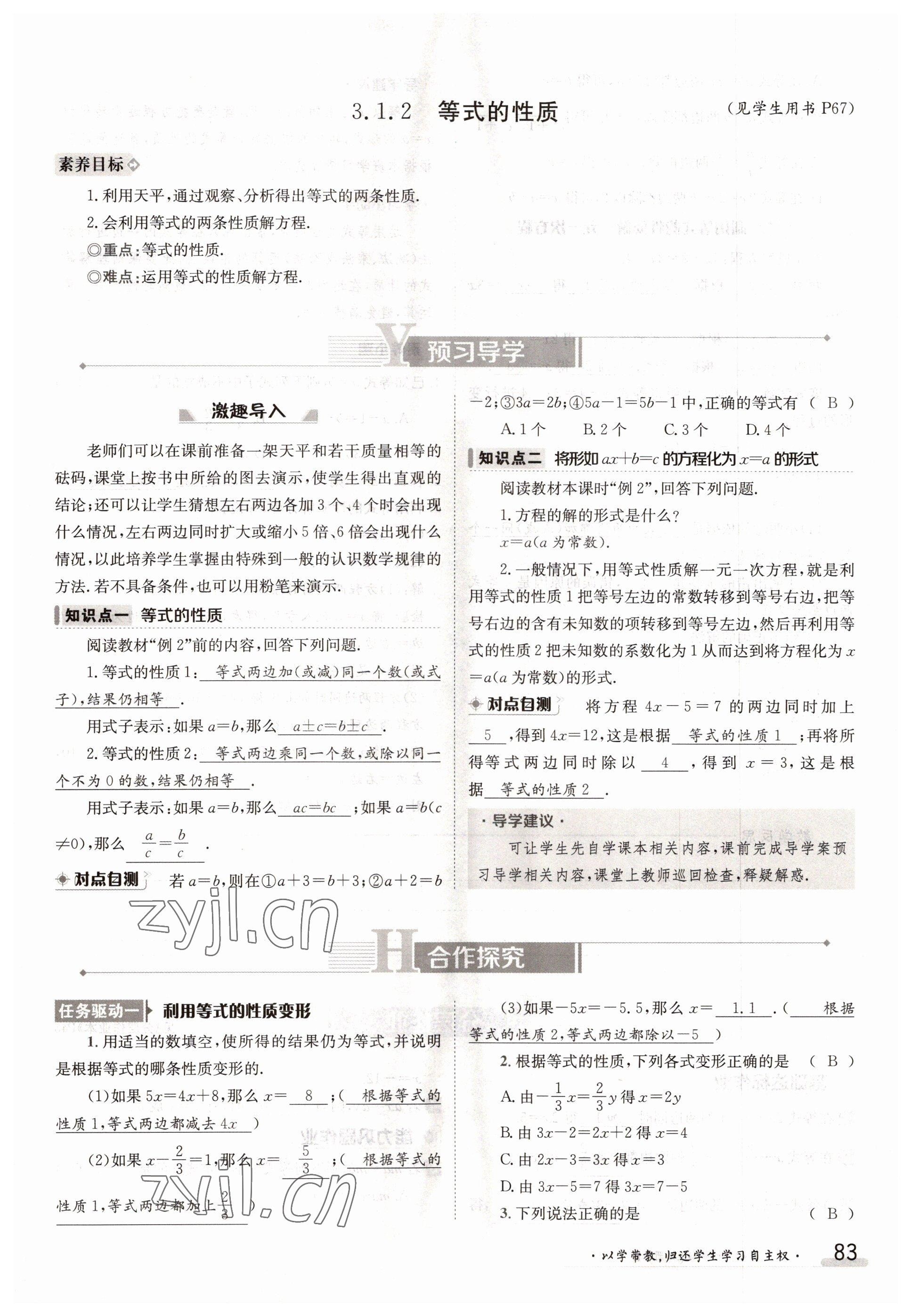 2022年金太阳导学案七年级数学上册人教版参考答案第83页