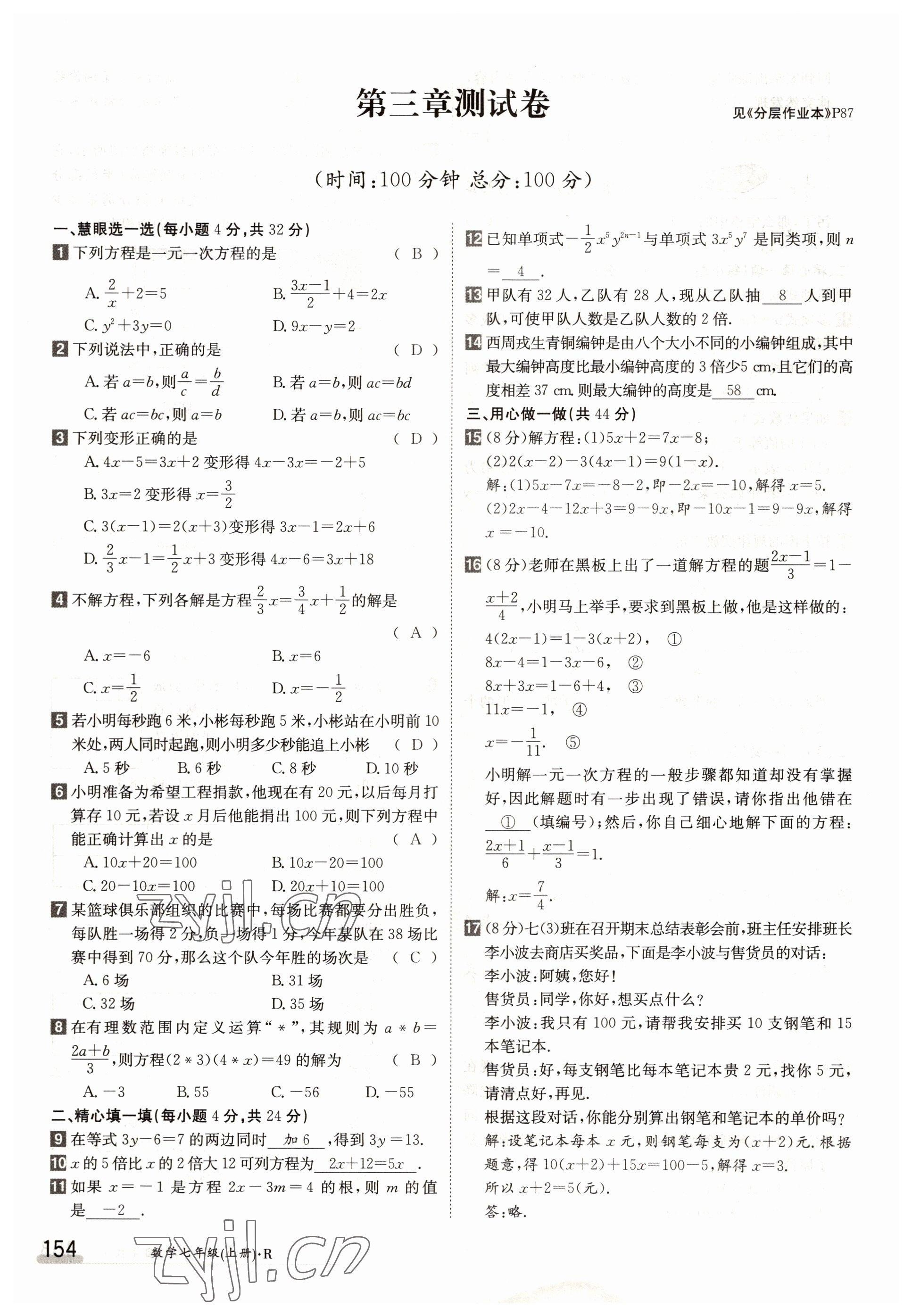 2022年金太阳导学案七年级数学上册人教版参考答案第154页