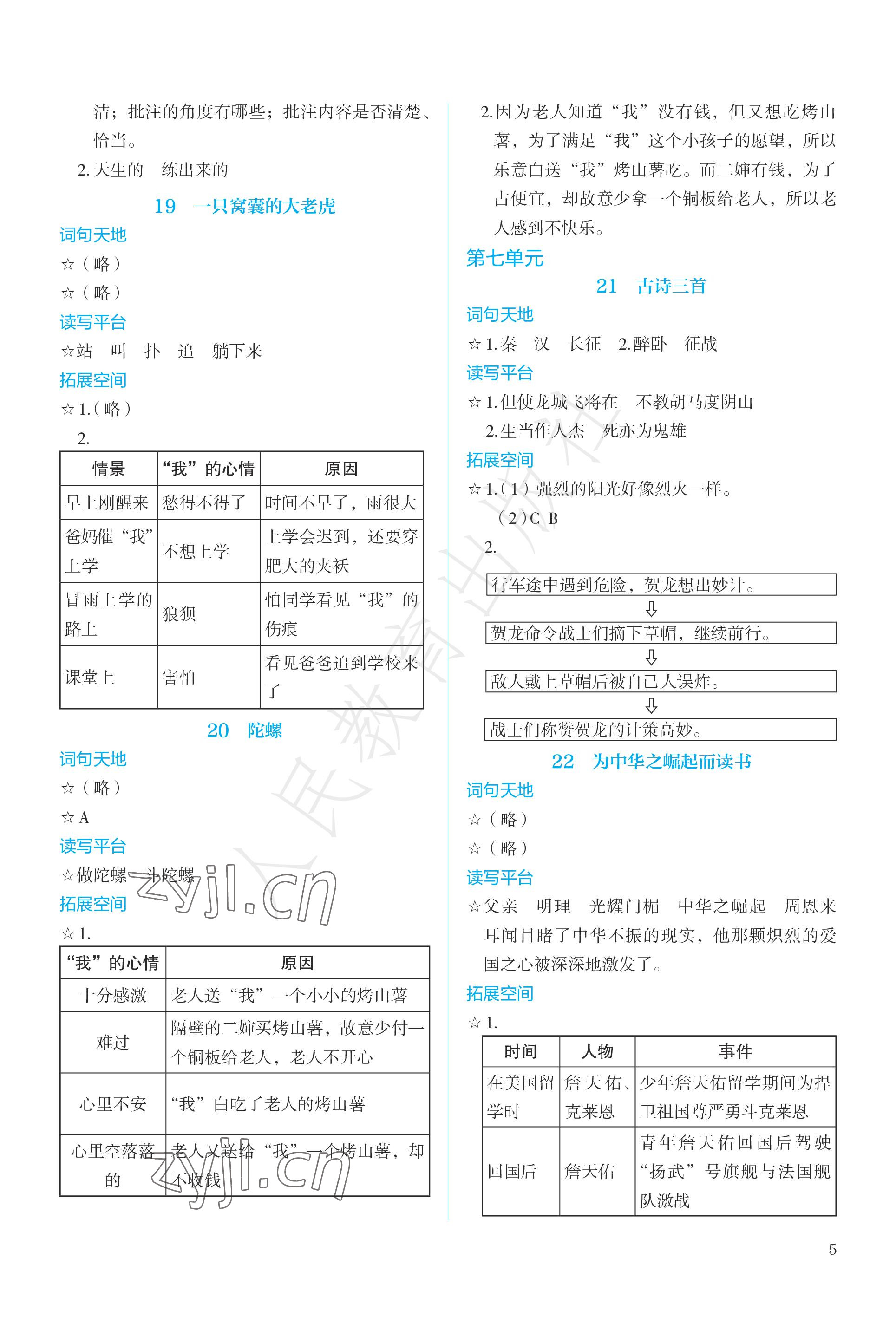 2022年人教金学典同步解析与测评四年级语文上册人教版参考答案第5页