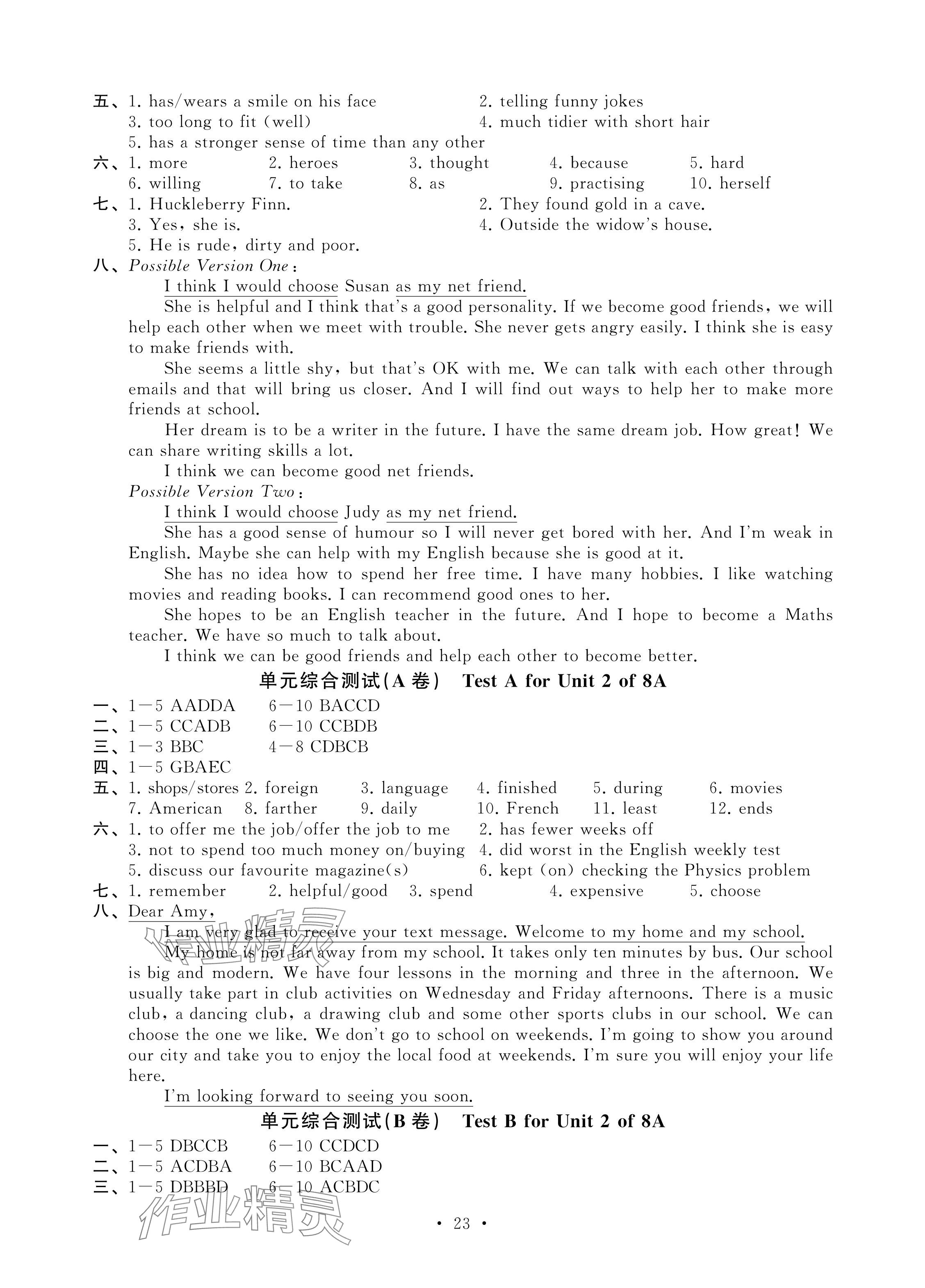 2024年综合素质随堂反馈八年级英语上册译林版无锡专版参考答案第23页