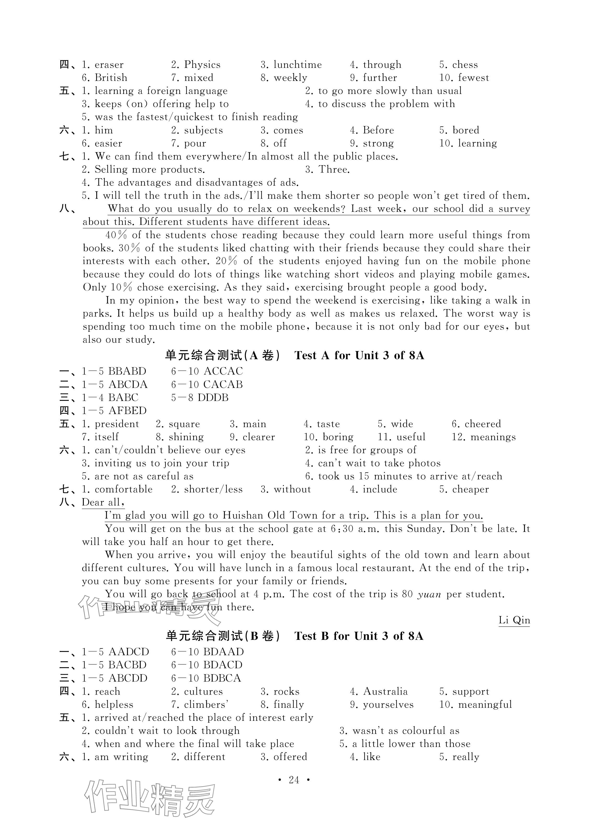 2024年综合素质随堂反馈八年级英语上册译林版无锡专版参考答案第24页