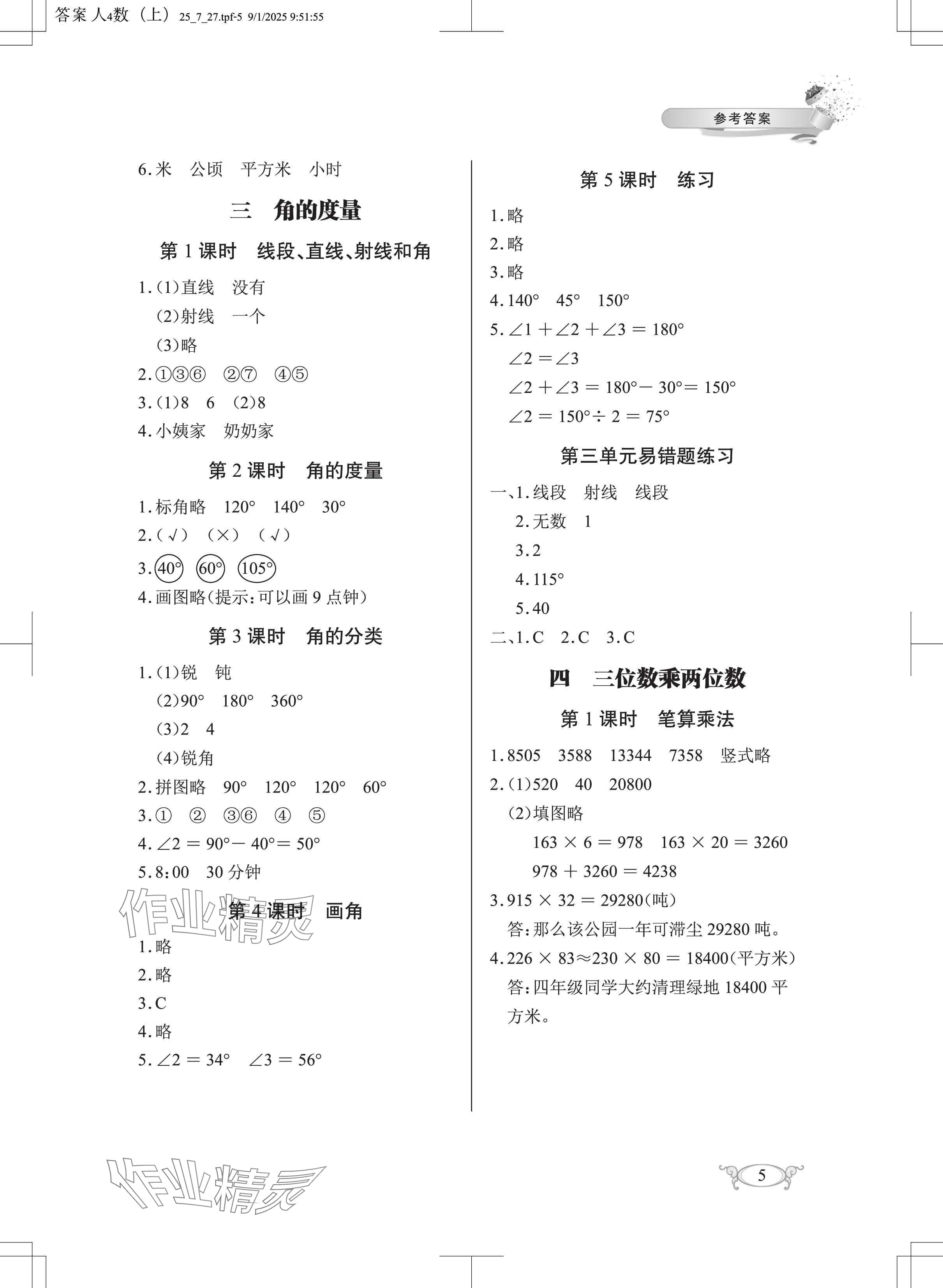 2025年长江作业本同步练习册四年级数学上册人教版参考答案第5页