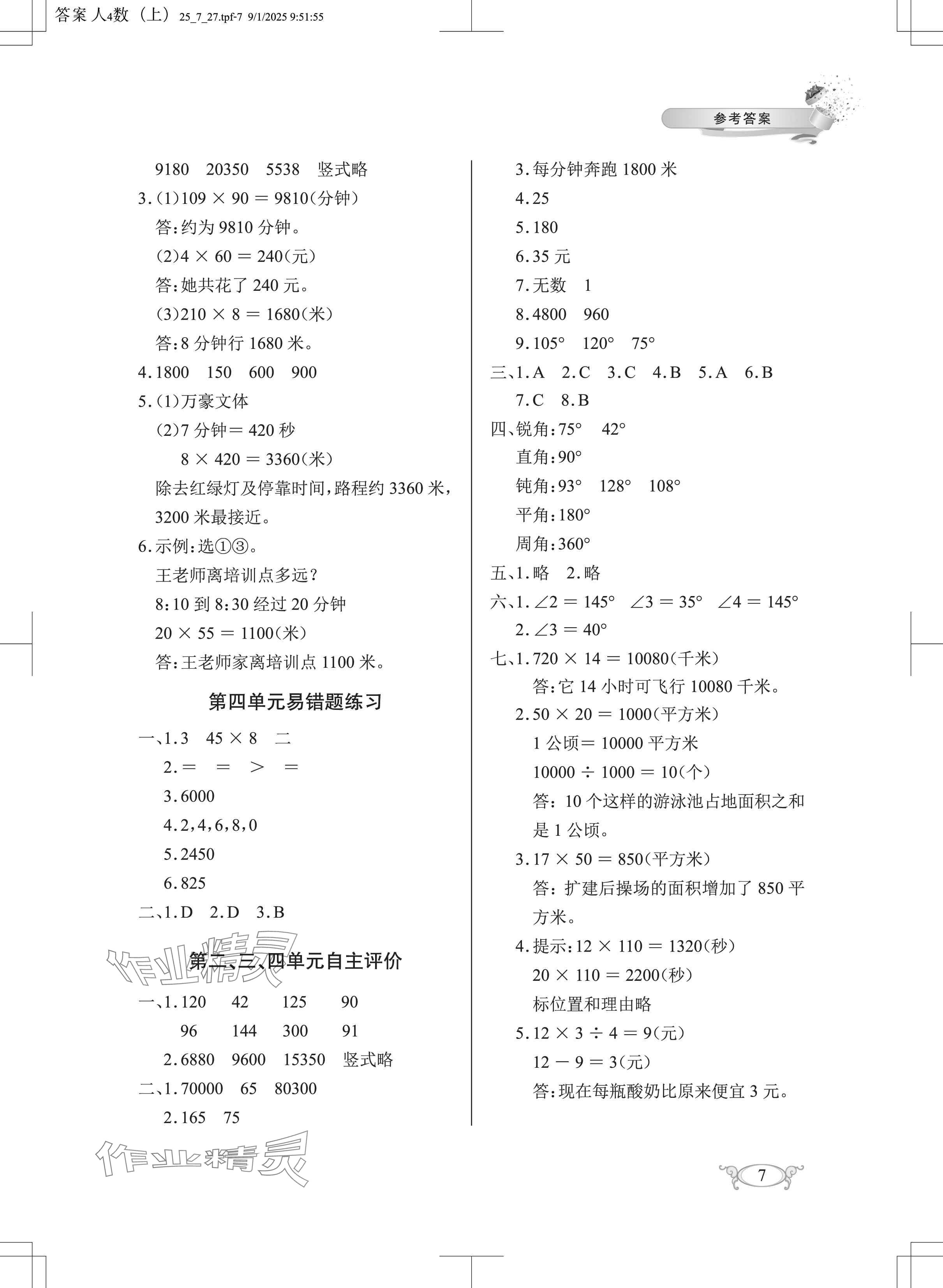 2025年长江作业本同步练习册四年级数学上册人教版参考答案第7页