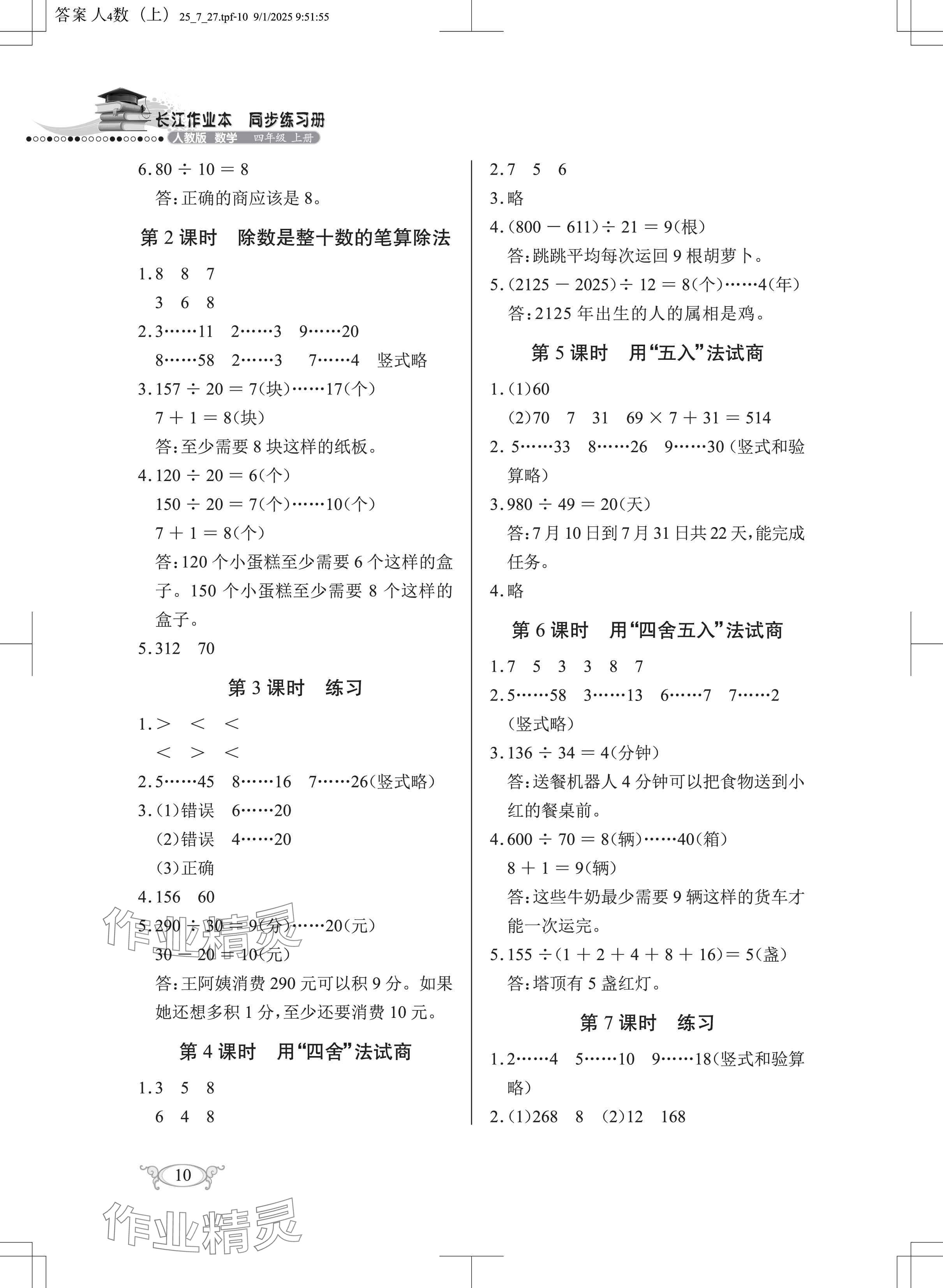 2025年长江作业本同步练习册四年级数学上册人教版参考答案第10页