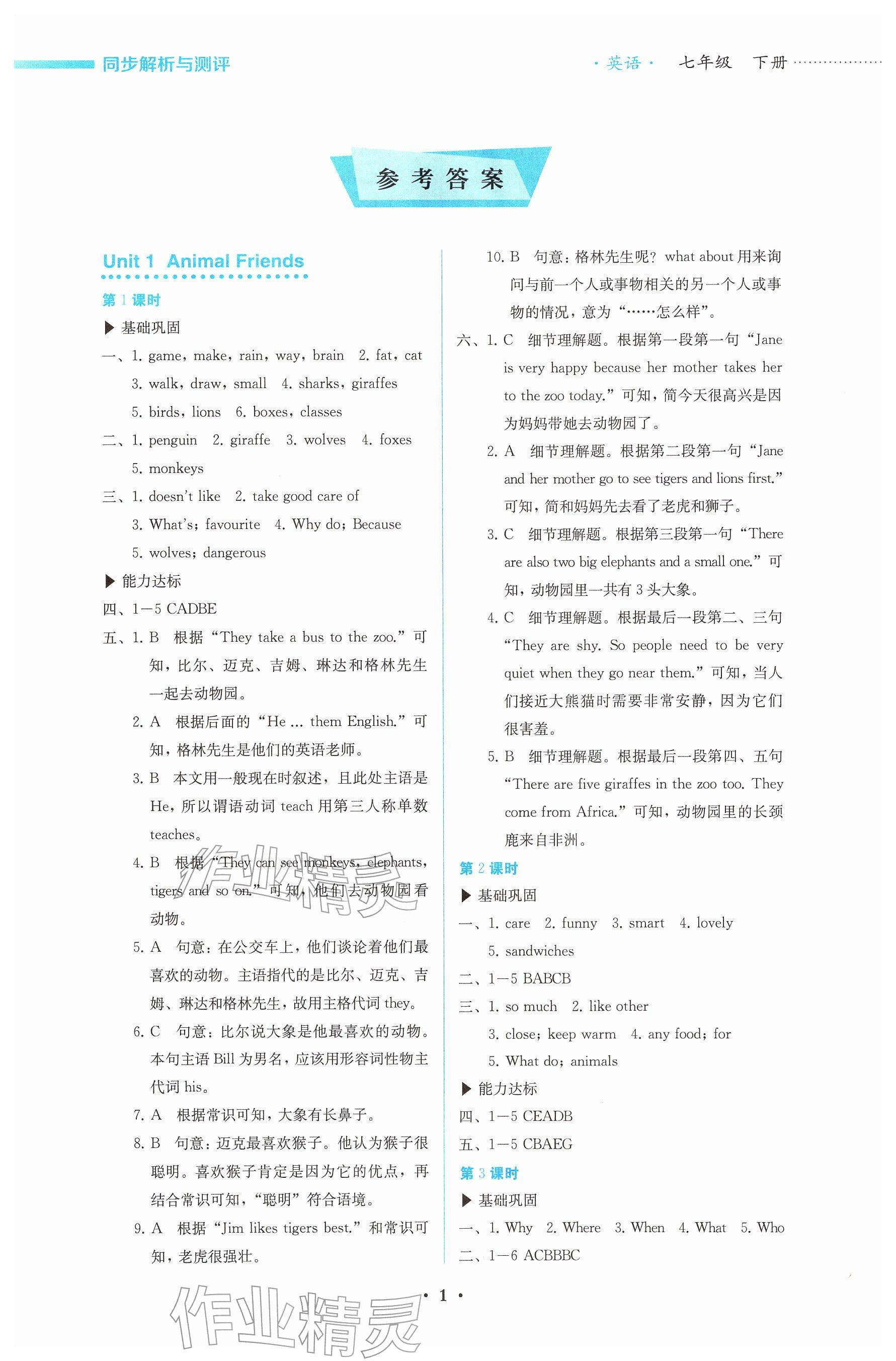 2026年人教金学典同步解析与测评七年级英语下册人教版参考答案第1页