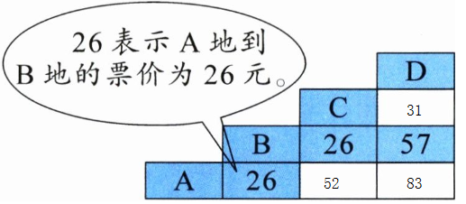 解析:由所给的信息可知,A 地到 B 地的票价为 26 元,B 地到 C 地的票价为 26 元,B 地到 D 地的票价为 57 元。先求 A 地到 C 地的票价,A 地到 C 地的票价分为两段,A 地到 B 地的票价+B 地到 C 地的票价,因此 A 地到 C 地的票价为 $26 + 26 = 52$(元)。再求 C 地到 D 地的票价,已知 B 地到 D 地的票价为 57 元,它是 B 地到 C 地的票价+C 地到 D 地的票价,因此 C 地到 D 地的票价为 $57 - 26 = 31$(元)。最后求 A 地到 D 地的票价,A 地到 D 地的票价可以分为两段,A 地到 C 地的票价+C 地到 D 地的票价,因此 A 地到 D 地的票价为 $52 + 31 = 83$(元)。A 地到 D 地的票价也可以分为 A 地到 B 地的票价+B 地到 D 地的票价,列式为 $26 + 57 = 83$(元)。
