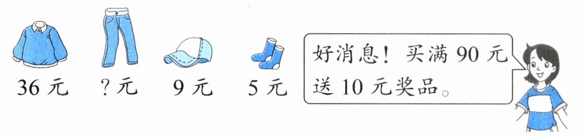 (3)$36 + 9 = 45$ (元) $90 - 45 = 45$ (元) $45 ÷ 5 = 9$ (双) 可以再买袜子,买 9 双。(答案不唯一)
