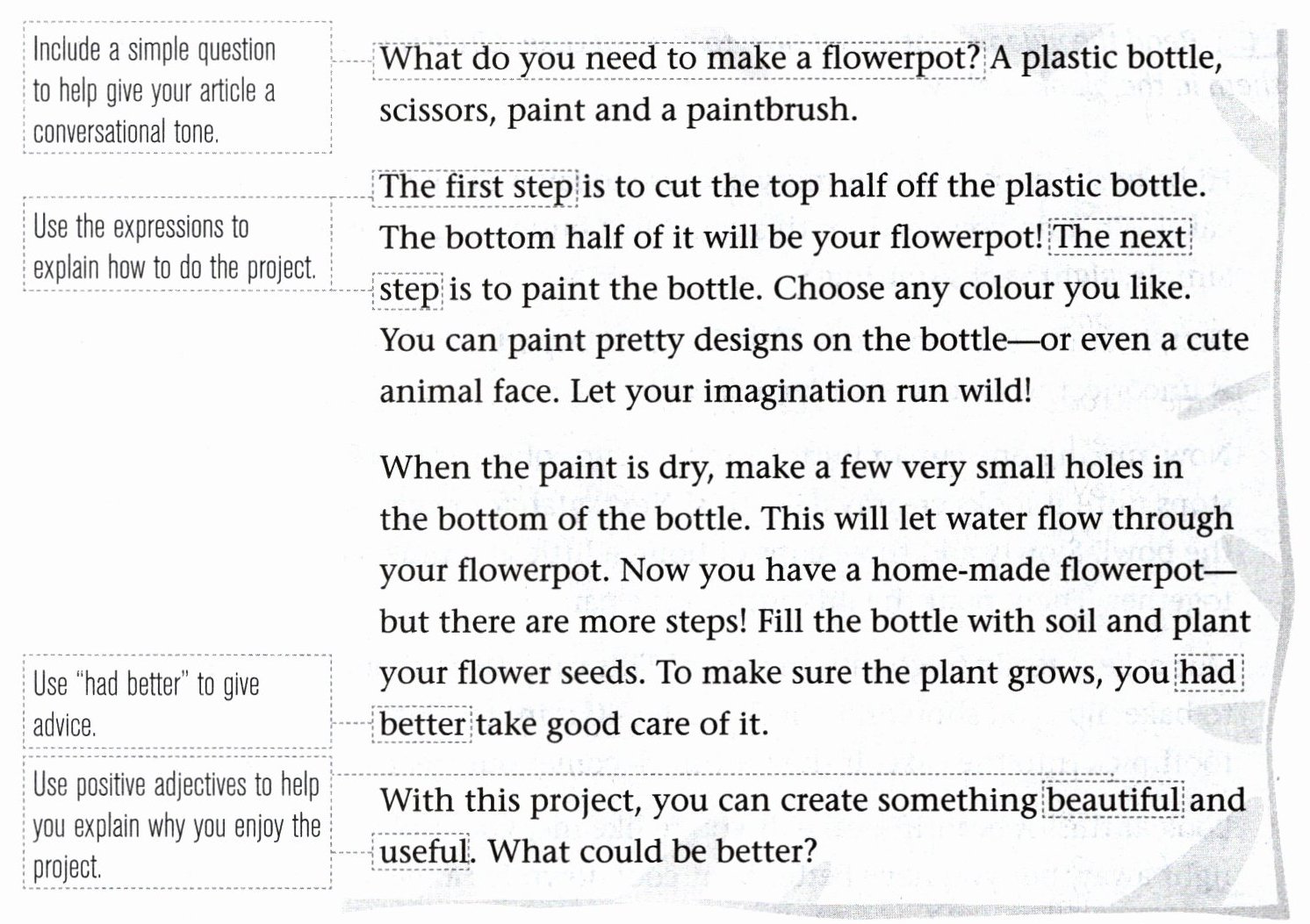 A 埃米正在写如何制作花盆。阅读她的文章,学习如何撰写一个手工项目介绍。