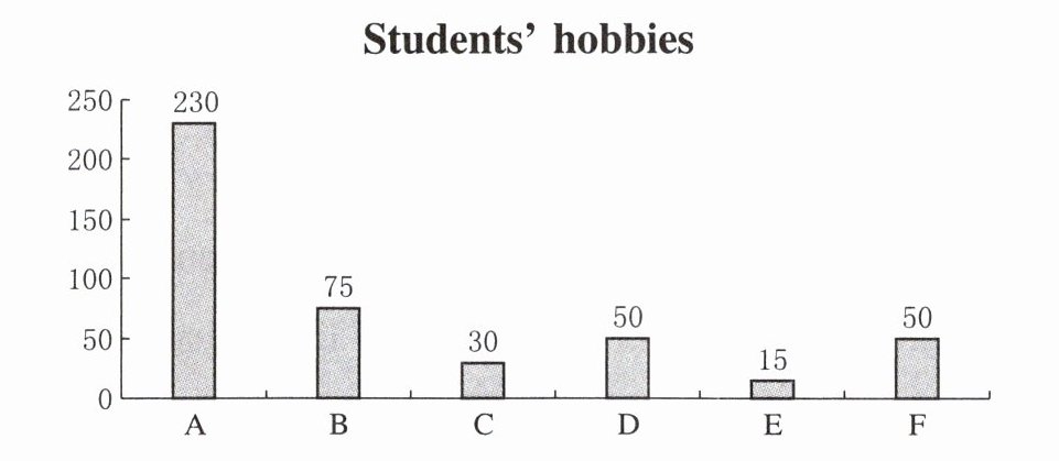 我的学校叫快乐小学。我们学校有450名学生。我们有不同的爱好。超过一半的学生喜欢阅读。他们中的一些人喜欢做运动,一些人喜欢演奏音乐等等。下面的图表显示了有不同爱好的学生的数量。