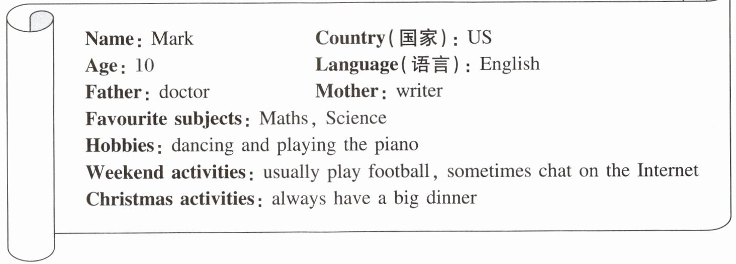 Mark is my e-friend. He lives in the US. He is 10 years old. He can speak English. His father is a doctor in a hospital. He helps sick people. His mother is a writer and she writes novels. Mark is good at Maths and Science. He likes dancing and playing the piano. He usually plays football with his classmates. He sometimes chats on the Internet. He always has a big dinner with his family at Christmas.