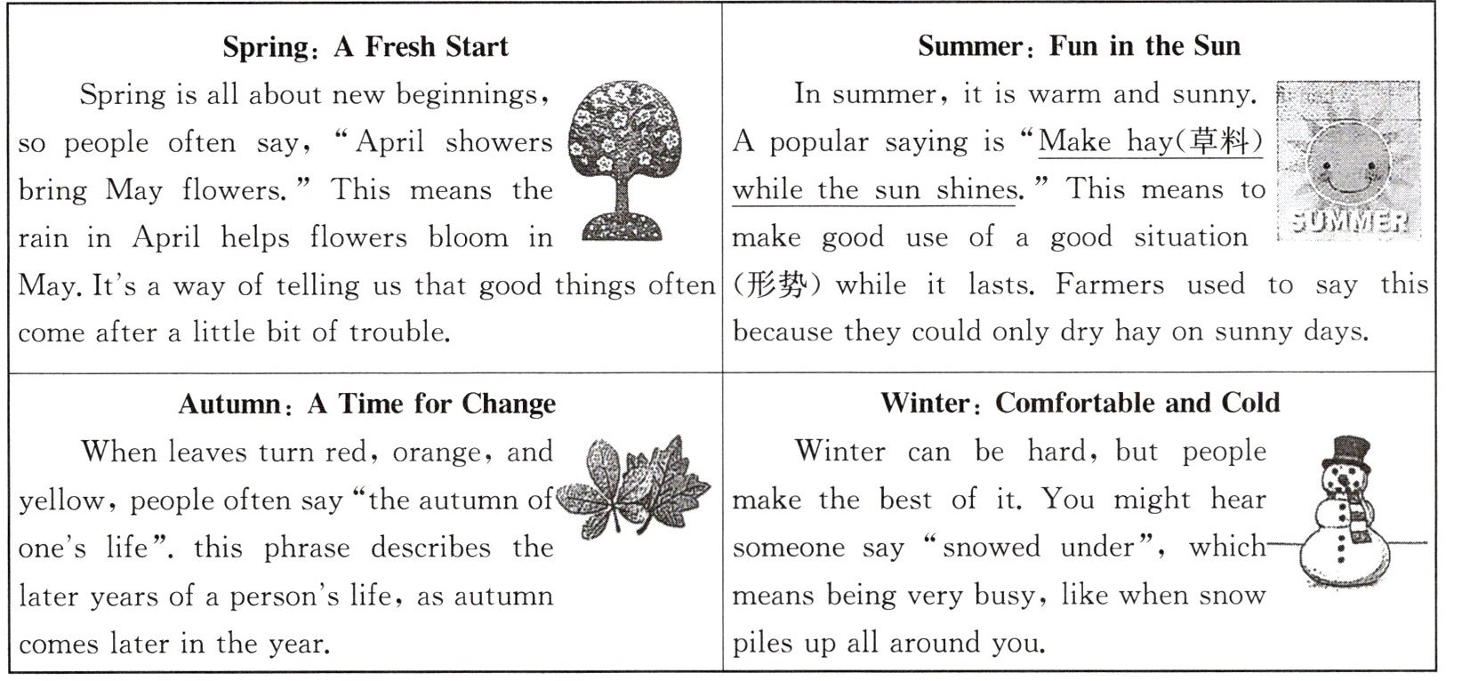 每个季节都会带来特别的事物——春天的花朵、夏天的阳光、秋天色彩斑斓的树叶以及冬天的雪花。多年来,人们围绕这些季节创造出了有趣的谚语和表达方式。让我们来了解其中的一些吧!