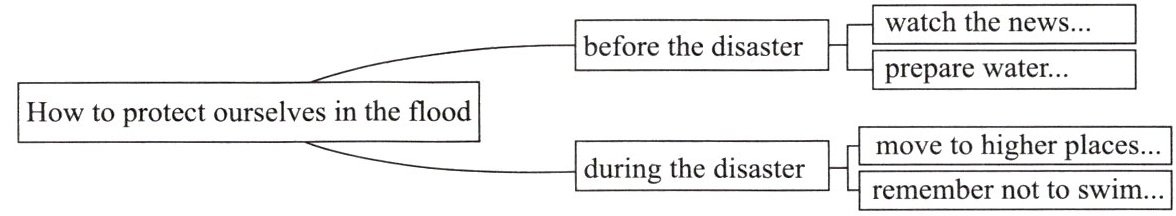 答案:protect ourselves in the flood. Firstly,we should often watch the news about the flood during the rainy season. We need to prepare water,food and medicine before the disaster comes. Secondly,when there is a flood,we must move to higher places at once and stay there to wait for rescue. Remember not to swim through the flood water. Thirdly,if the flood washes us away,we should keep calm. We can catch something made of wood and it can help us get out of the water. If we need help,we can also call the police.