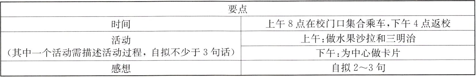 (2025·江苏无锡天一实验中学期中)假如你是Suzy,是一名八年级的学生,上星期五你和同学们去DIY中心玩。请根据下面表格中的信息以“My School Trip to the DIY Centre”为题用英语写一篇短文。