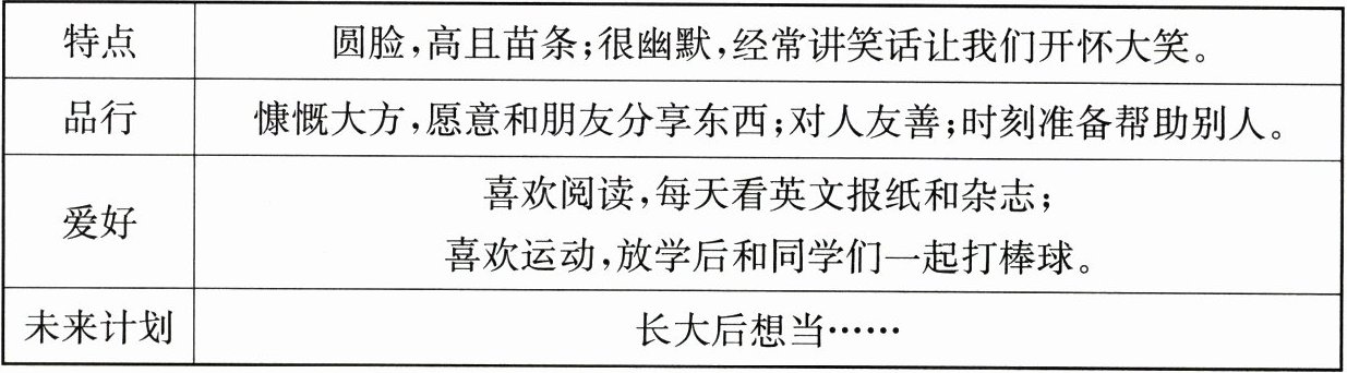 答案:One possible version: My Best Friend I have a wonderful friend named Linda. I'd like to tell you something about her. She is tall and slim with a round face. She has a great sense of humour and often tells us jokes that make us laugh. Linda is generous and enjoys sharing her things with her friends. She is friendly and always ready to help others in need. Her hobbies include reading and playing sports. She reads English newspapers and magazines every day. After school, she plays baseball with her classmates. In the future, she wants to become a teacher to teach children.