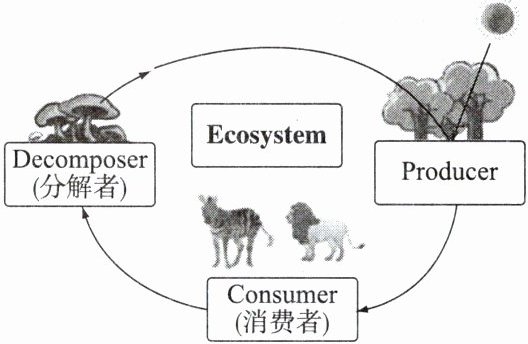 There are three jobs in an ecosystem: producer, consumer and decomposer. The trees in the forest produce food by themselves. Giraffes themselves can’t make their own food, so they consume or eat the trees’ leaves. But sometimes hungry lions or other animals eat giraffes. When animals die, their bodies become part of the soil(土壤) and air to help the forest grow. So the ecosystem can keep on going.