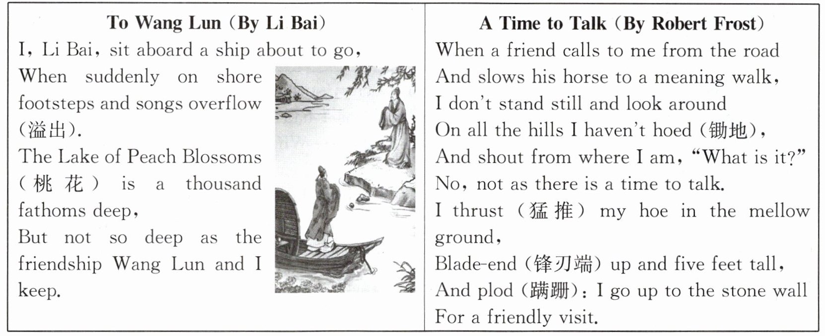 Both poems are famous in their cultures, but they tell different stories. Li Bai described the scene of his friend seeing him off. US poet Robert Frost wrote about a friend's visit when he was working. Li made a comparison (比较). His poem shows the friendship between him and his friend is deeper than the deep water. Frost's poem, however, tells the readers that we should stop what we are doing to talk with our friends. It tells us that nothing should get in the way of spending time with friends. The language is simple but sincere (真挚的).