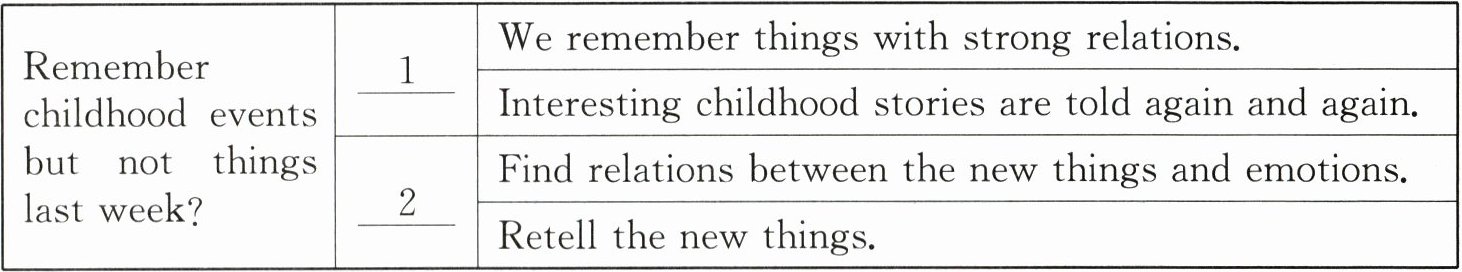 A1: We remember things that have strong relations (关联) in our mind, especially emotional (情绪的) ones. Childhood memories are often these, because when we experience things for the first time, we often have strong feelings of fear (害怕) or excitement. Also, interesting or funny childhood stories are often told again and again. As a result, we remember them much better, as retelling (复述) events helps fix experiences in our memories. So when remembering something new, find its relation to our emotions, or retell it to others.