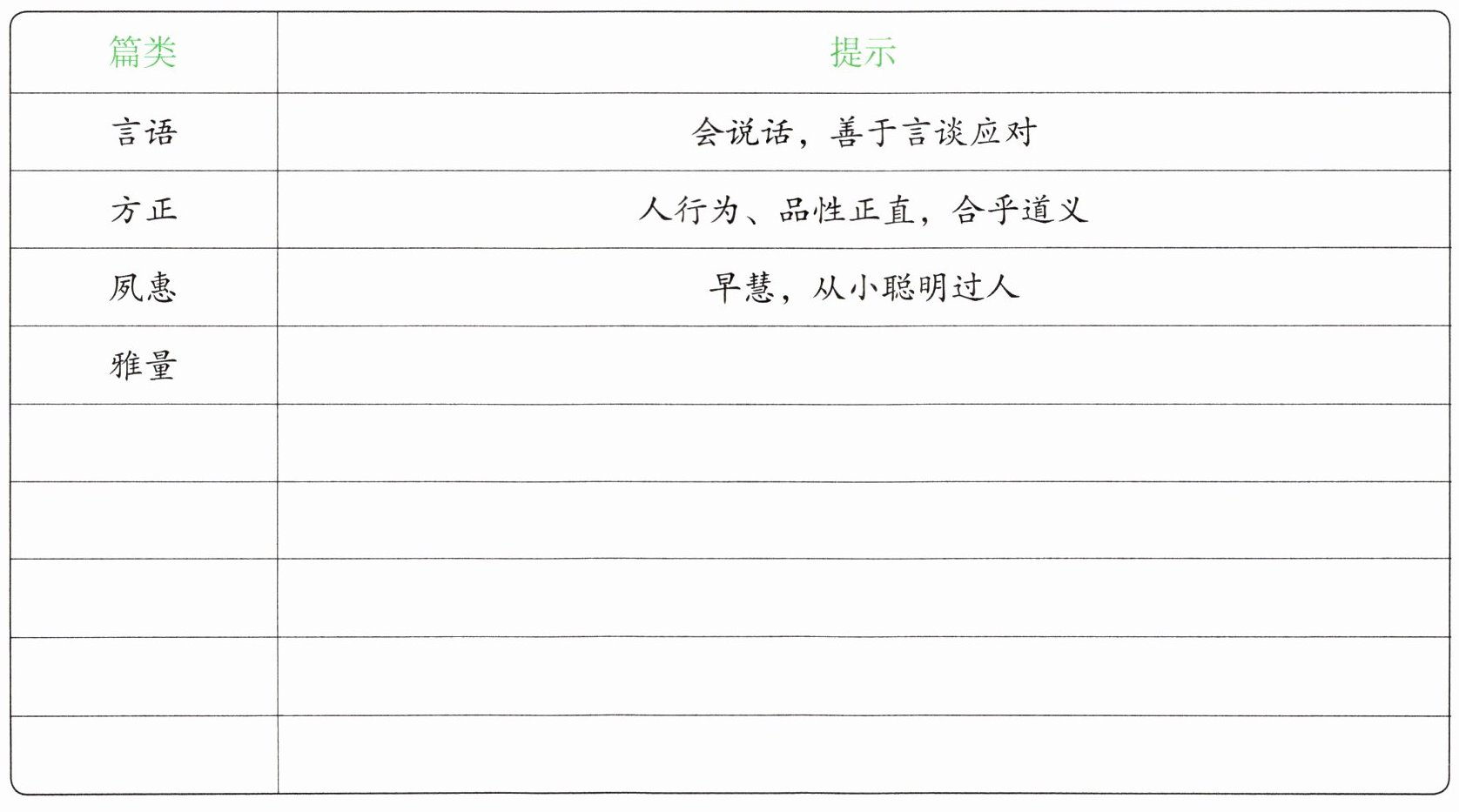 答案:[示例]雅量:深藏不露,临危不惧,处变不惊 德行:士族阶层值得学习、可作准则典范的言语行动 容止:评论人容貌、态度、举止的故事