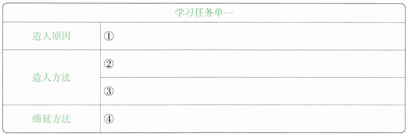 答案:① 改变世间的荒凉寂寞 ② 揉泥成团造人 ③ 挥藤洒泥造人 ④ 男女配合,创造后代