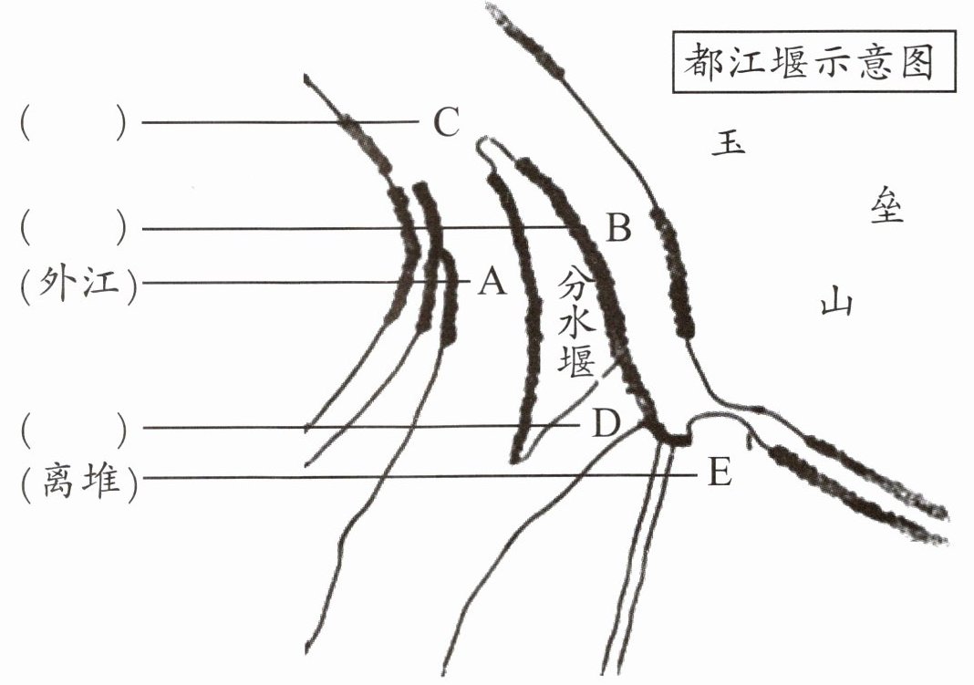 2. 读短文,照样子将都江堰水利工程组成部分的序号填在相应位置,完成都江堰示意图。