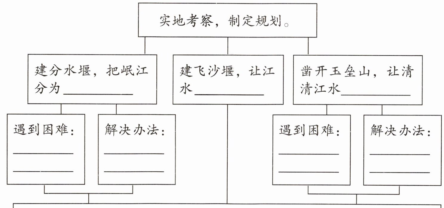 为了解决这个问题,李冰进行了实地考察,制定出治水规划:先建一个分水堰(yàn),将岷江分为内外江,内江的水穿过玉垒(lěi)山,外江的水顺着旧河道流向下游;然后在内江建一个飞沙堰,让江水第二次分流,变得清澈;最后凿开玉垒山,让江水沿着引水渠流到平原,灌溉良田。