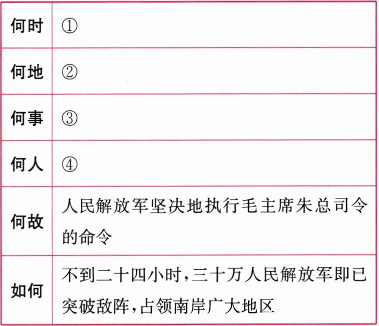 答案:(1)①1949年4月20日午夜到21日 ②芜湖、安庆之间 ③南渡长江 ④人民解放军(约三十万人)
