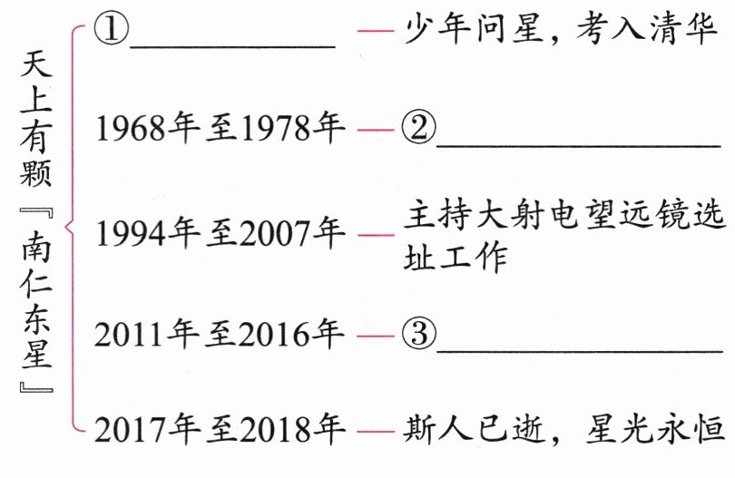 答案:①1945年至1963年 ②工厂实践,研发新产品 ③“中国天眼”落成启用