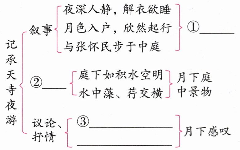 答案:①中庭赏月 ②写景 ③何夜无月?何处无竹柏?但少闲人如吾两人者耳