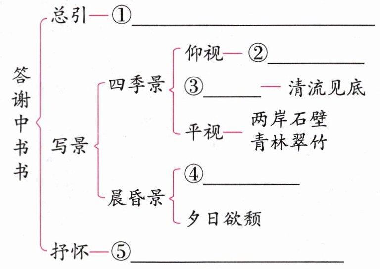 答案:①山川之美,古来共谈 ②高峰入云 ③俯视 ④晓雾将歇 ⑤欲界之仙都