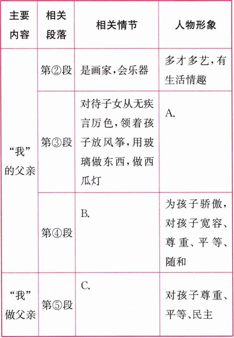 ③父亲是个很随和的人,我很少见他发脾气,对待子女,他从无疾言厉色。他爱孩子,喜欢孩子,爱跟孩子玩,带着孩子玩。我的姑妈称他为“孩子头”。春天,不到清明,他领着一群孩子到麦田里放风筝。放的是他自己糊的蜈蚣,是用染了色的绢糊的。放风筝的线是胡琴的老弦。老弦结实而轻,这样风筝可笔直地飞上去,没有“肚儿”。用胡琴弦放风筝,我还未见过第二人。孩子们在屋里闷了一冬天,在春天的田野里奔跑跳跃,身心都极其畅快。他用钻石刀把玻璃裁成不同形状的小块,再一块一块地逗拢,接缝处用胶水粘牢,做成小桥、小亭子、八角玲珑水晶球。桥、亭、球是中空的,里面养了金铃子。从外面可以看到金铃子在里面自在爬行,振翅鸣叫。他会做各种灯。用浅绿透明的“鱼鳞纸”扎了一只纺织娘,栩栩如生。在小西瓜上开小口,挖净瓜瓤,在瓜皮上雕镂出极细的花纹,做成西瓜灯。我们在这些灯里点了蜡烛,穿街过巷,邻居的孩子都跟过来看,非常羡慕。
