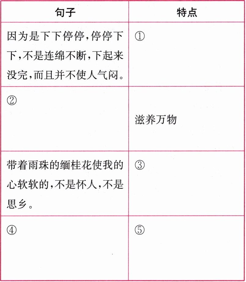 ③能让人内心安静柔软 ④密匝匝的细碎的绿叶,数不清的半开的白花和饱涨的花骨朵,都被雨水淋得湿透了。 ⑤滋润万物