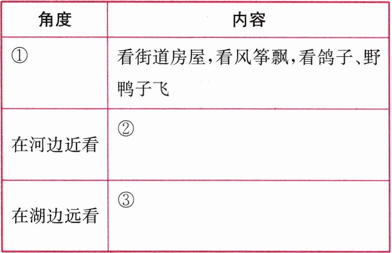 1. 文章围绕“看”写了多个场景,请根据提示完成下面的表格。