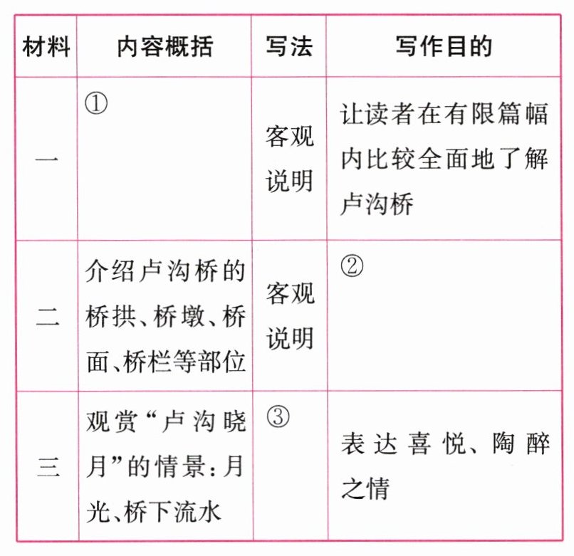 1. 三则材料都写到了卢沟桥,但内容、写法和目的各有不同,请根据提示完成下表。