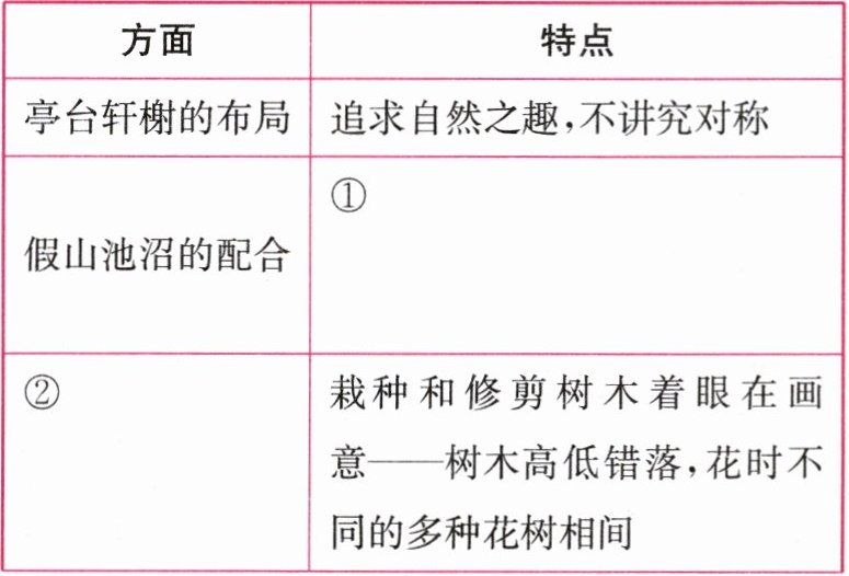 2. 课文主体部分围绕苏州园林的整体特征,分别从七个方面进行了具体介绍。请根据提示完成下表。