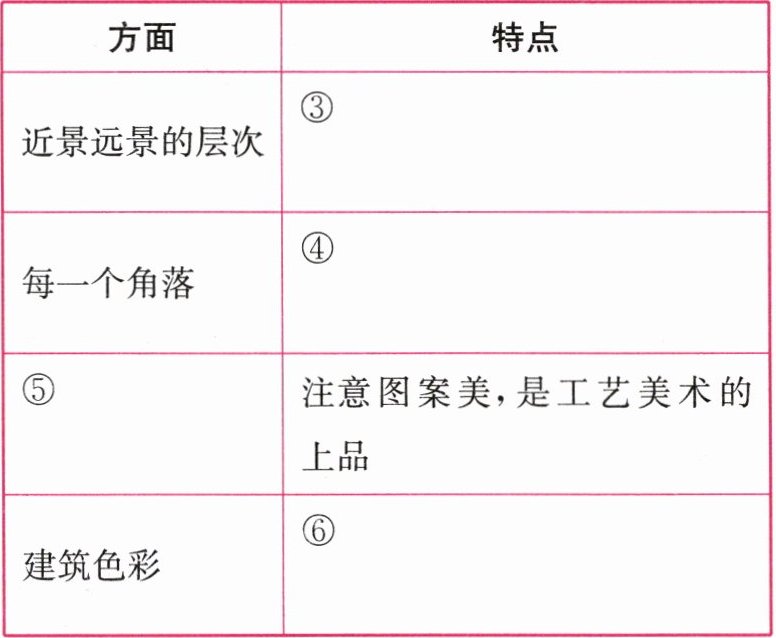 答案:①假山的堆叠给人置身山间的感觉;池沼或河道的边沿总是高低屈曲任其自然,有“入画”感 ②花草树木的映衬 ③花墙和廊子的修建,隔而不隔,界而未界,使园林层次更多,景致更深 ④注意图画美,就极小范围的局部看,也能得到美的享受 ⑤门和窗 ⑥极少使用彩绘,注意色彩搭配的协调美