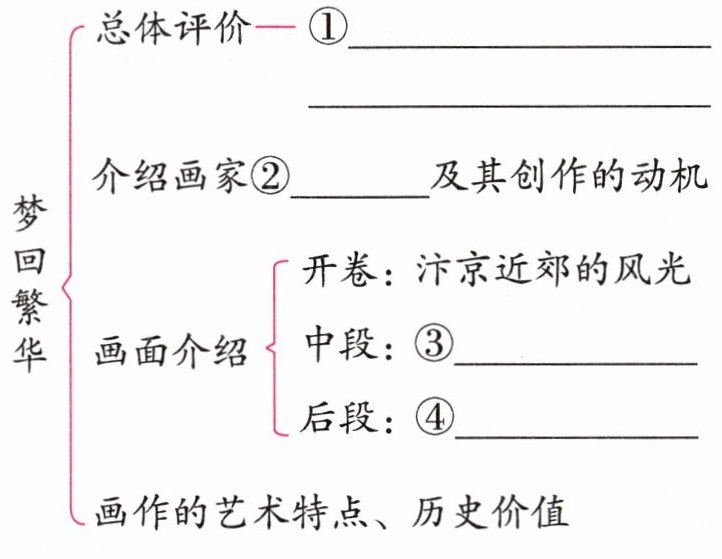 答案:①北宋风俗画作品中最具代表性的一幅 ②张择端 ③汴河两岸的繁华情景 ④汴京市区的街道