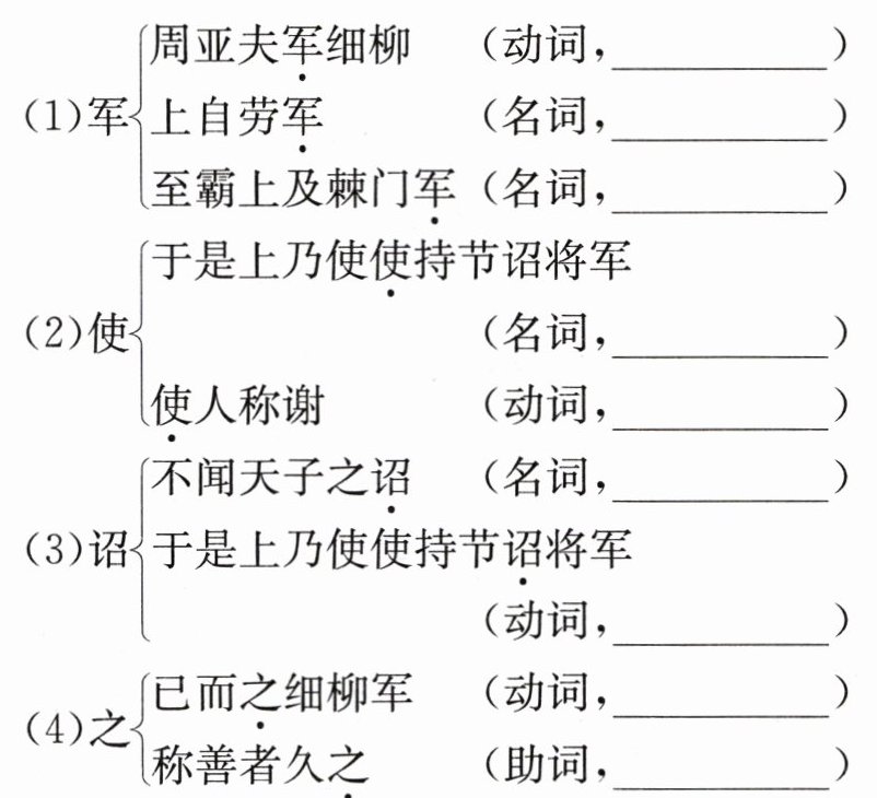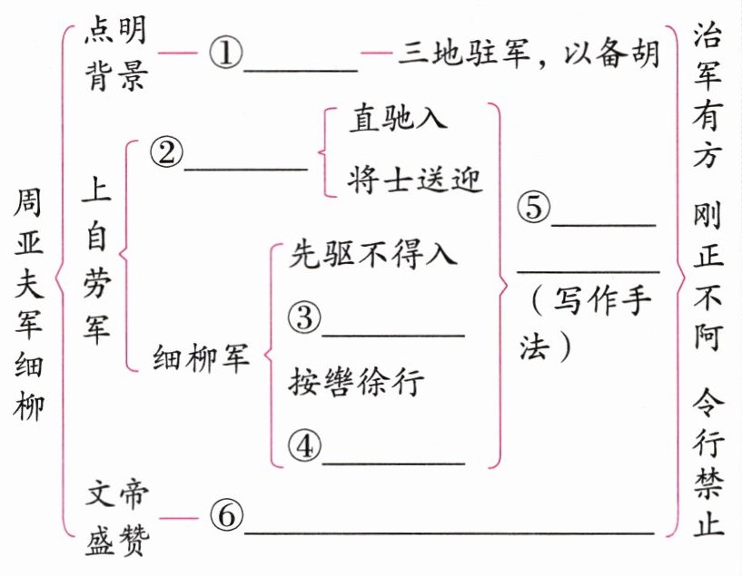 答案:①匈奴大入边 ②霸上及棘门军 ③上至,又不得入 ④亚夫持兵揖 ⑤对比 ⑥此真将军矣