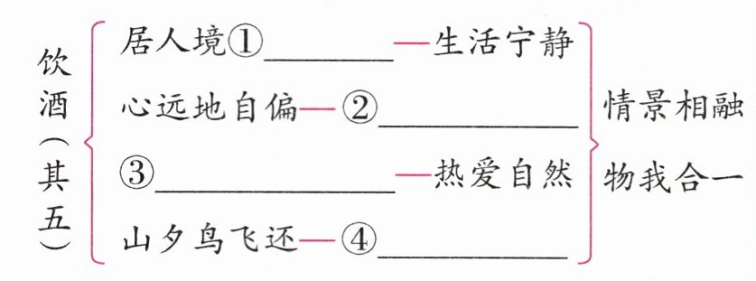 答案:①无车马喧 ②内心恬淡 ③采菊东篱下 ④生命真谛