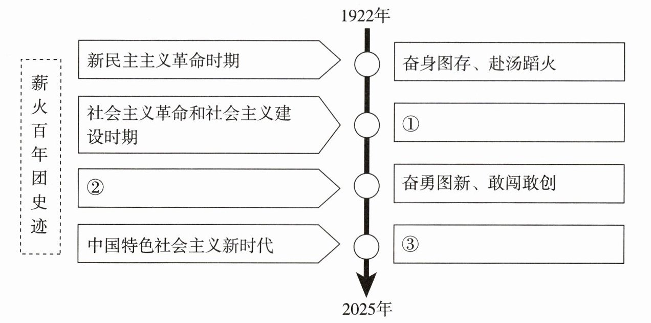 9. 学校开展“传承百年梦·青春正当时”团课大讲堂活动。作为共青团团史宣讲人,为了直观形象地向同学们展示百年建团史,你设计了下面的思维导图。请从材料一中提取相关信息,把空缺处的内容补充完整。(6分)