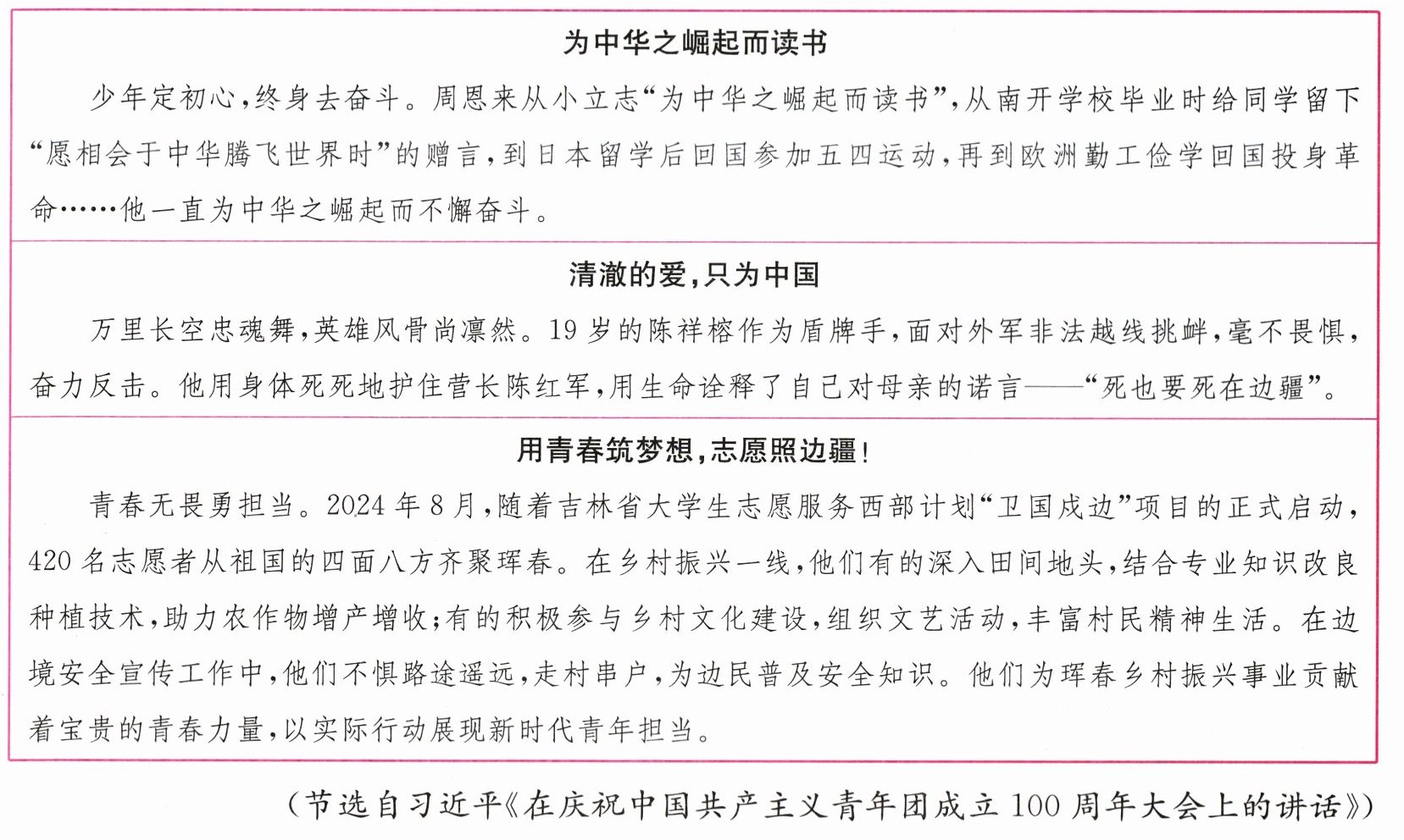 青春的模样到底是什么? 是热血沸腾,志在远方;是不忘初心,奉献担当;还是……回首百年团史,我懂得了:青春是周恩来少年发奋,矢志不渝,为共产主义奋斗终身的坚定信仰;青春是陈祥榕①______;青春是志愿者②______。在最该绽放的年纪释放出自己应有的活力与激情,这就是青春的模样!