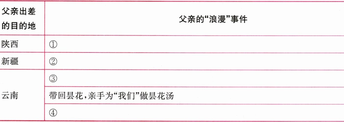 3. 回忆性散文通过对典型事件的描写来刻画人物形象。本文回忆了父亲归来那一天,用自己独特的方式给家人带来生活的“浪漫”。请你阅读全文,简要概括父亲的“浪漫”事件。(每件事不超过 15 字)(8分)