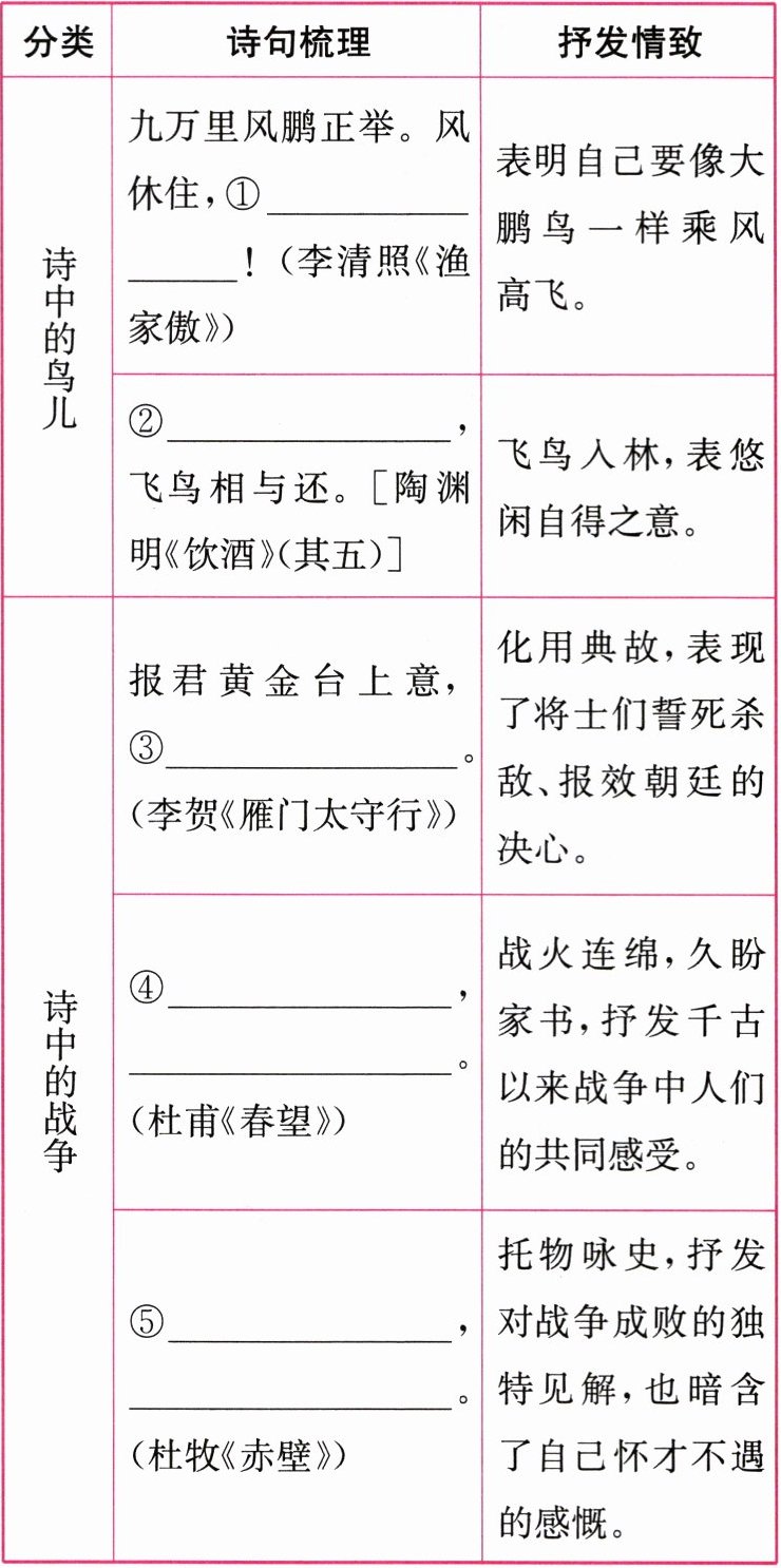 答案:①蓬舟吹取三山去 ②山气日夕佳 ③提携玉龙为君死 ④烽火连三月 家书抵万金 ⑤东风不与周郎便 铜雀春深锁二乔