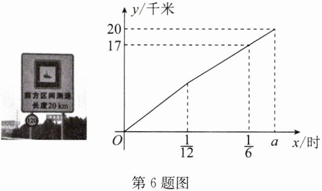 6. (2024·长春) 区间测速是指在某一路段前后设置两个监控点,根据车辆通过两个监控点的时间来计算车辆在该路段上的平均行驶速度. 小春驾驶一辆小型汽车在高速公路上行驶,其间经过一段长度为 20 千米的区间测速路段,从该路段起点开始,他先匀速行驶 $ \frac{1}{12} $ 小时,再立即减速以另一速度匀速行驶 (减速时间忽略不计),当他到达该路段终点时,测速装置测得该辆汽车在整个路段行驶的平均速度为 100 千米/时. 汽车在区间测速路段行驶的路程 $ y $(千米) 与在此路段行驶的时间 $ x $(时) 之间的函数图象如图所示.