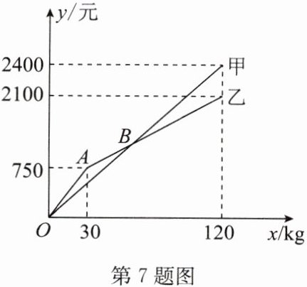 7. 某水果店购进甲、乙两种苹果的进价分别为 8 元/kg、12 元/kg,这两种苹果的销售额 $ y $(元) 与销售量 $ x $(kg) 之间的关系如图所示.