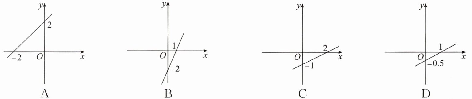 3. (2024·扬州)如图,已知一次函数 $y =  kx + b(k \neq 0)$ 的图象分别与 $x$ 轴、$y$ 轴交于 $A$,$B$ 两点,若 $OA =  2$,$OB =  1$,则关于 $x$ 的方程 $kx + b =  0$ 的解为